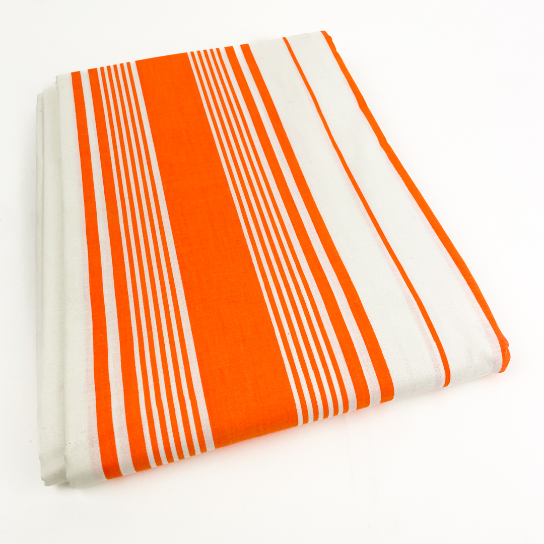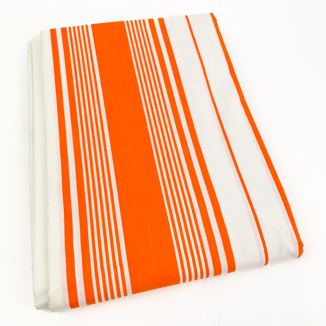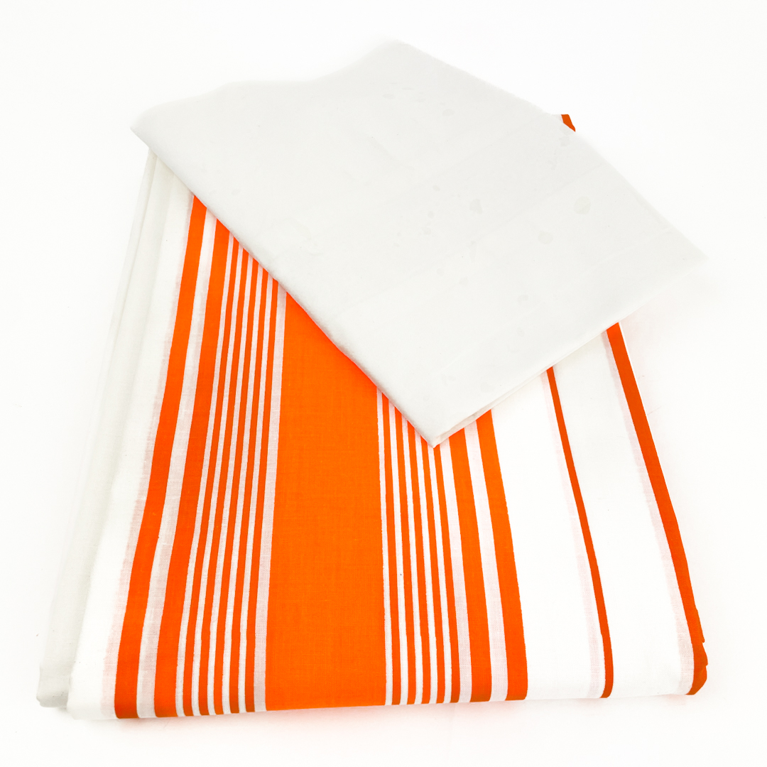 Flot retro sengesæt i ren bomuld med orange og hvide striber, samt hvidt pudebetræk