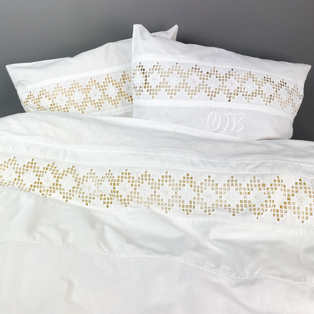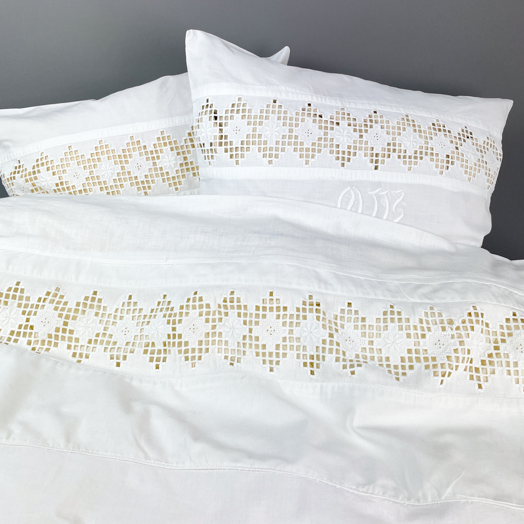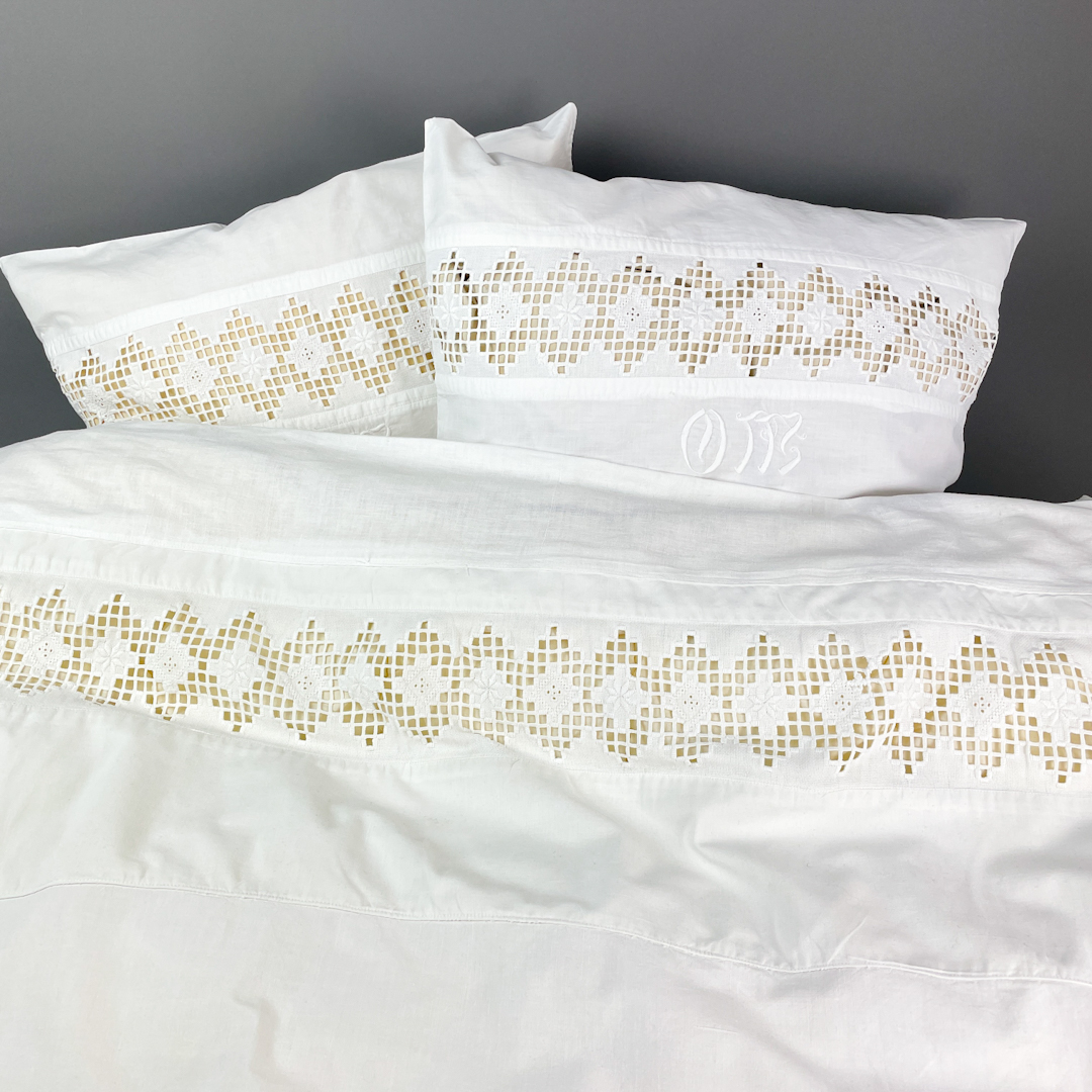 Smukt gammelt sengesæt i hvid ren bomuld med bredt håndlavet mellemværk og fint broderet monogram på både dynebetræk og begge medfølgende pudebetræk.
