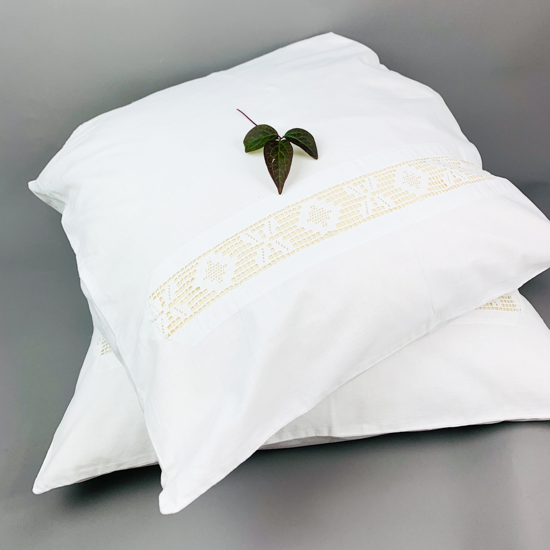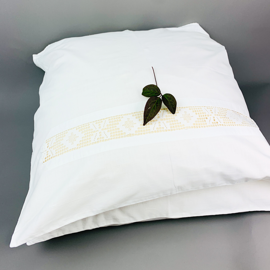 Smukt hvidt pudebetræk i ren bomuld med bred mellemværk og monogram