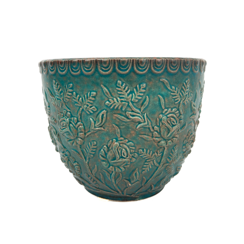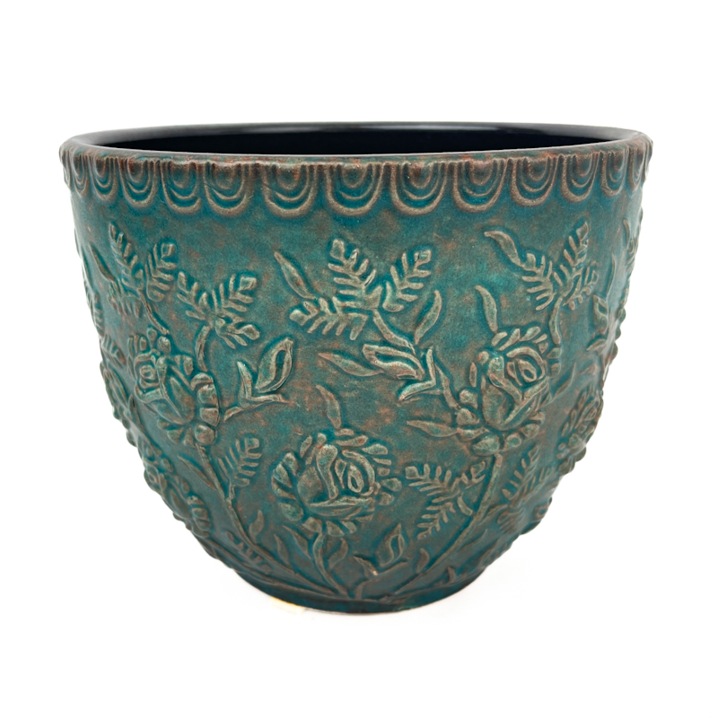 Smuk vintage urtepotte fra West Germany i grønblå keramik med flot reliefmønster af blomster og fine detaljer.