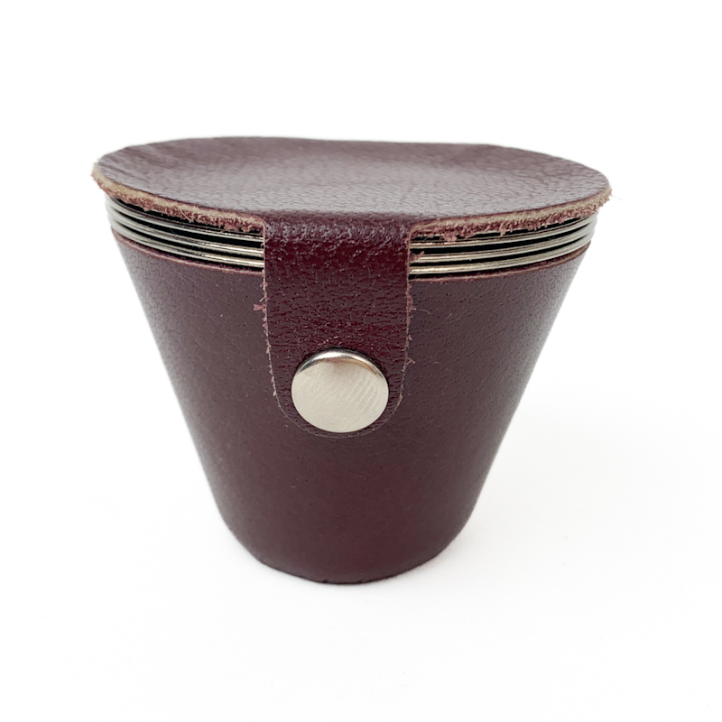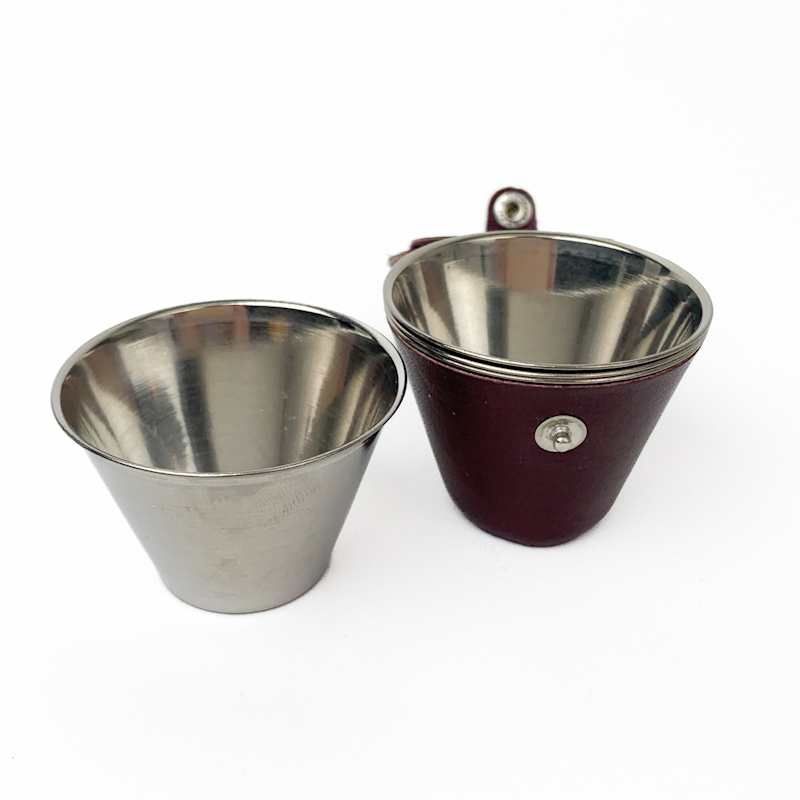 Fint lille vintage sæt med fire rejsebægre i metal samlet i et mørkerødt etui i kunstlæder.