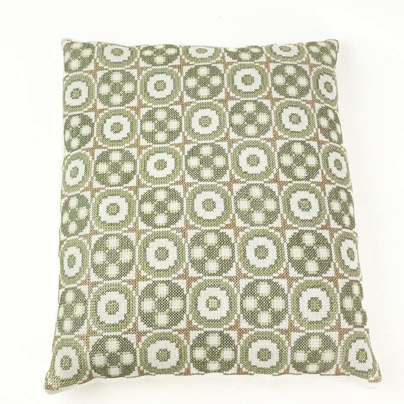 Flot retro pyntepude i grønlige nuancer med broderet mønster på forsiden.