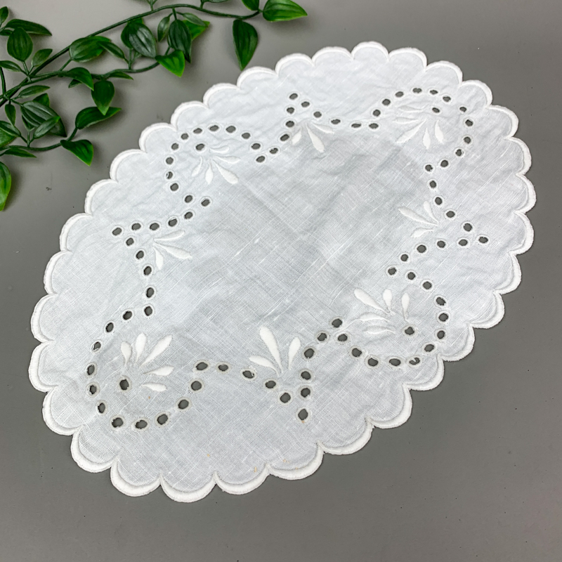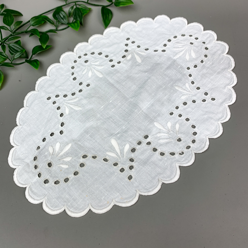 Fin hvid vintage lysedug i ren bomuld med smukt gammelt håndarbejde. Dugen har dekorativt gennembrudsarbejde og bølget kant hele vejen rundt.
