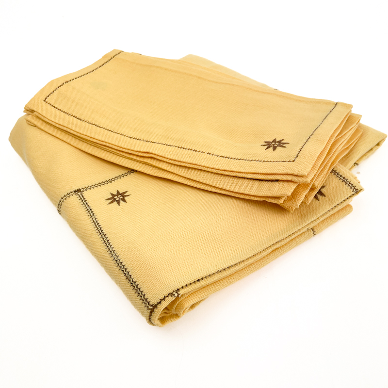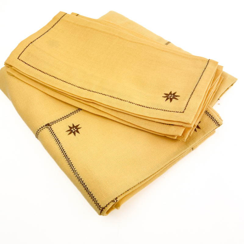 Smuk gul vintage dug med broderi og matchende servietter i samme udtryk.