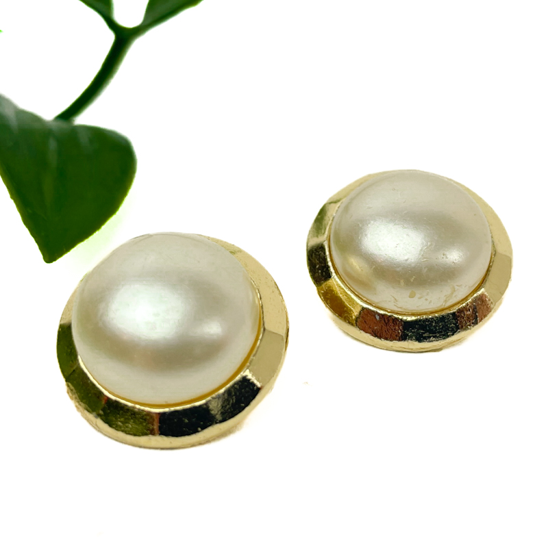 Vintage øreklips med hvide perler monteret i gyldne fatninger med let facetslebet kant.