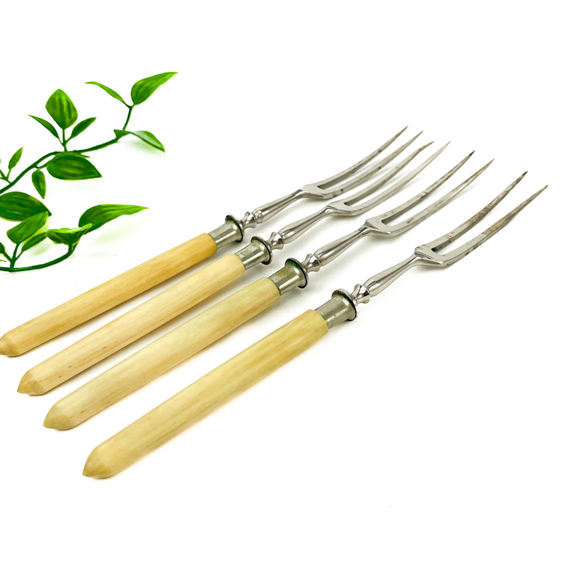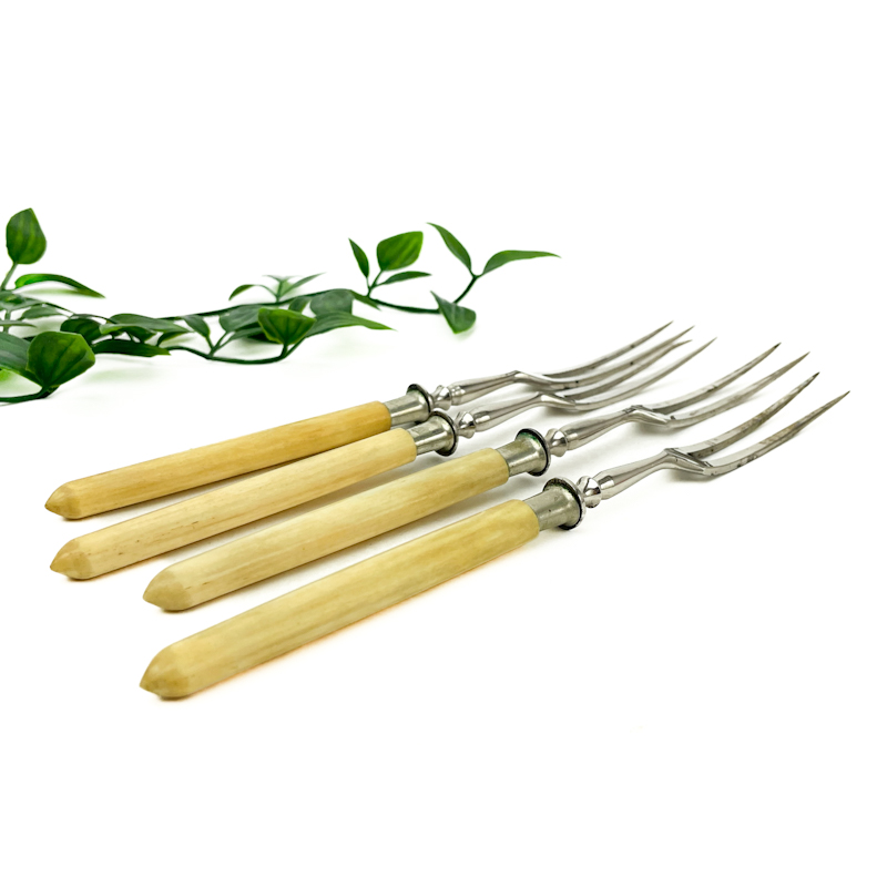 Fire fine vintage pålægsgafler med lyse skaft i ben og blanke metaldele.
