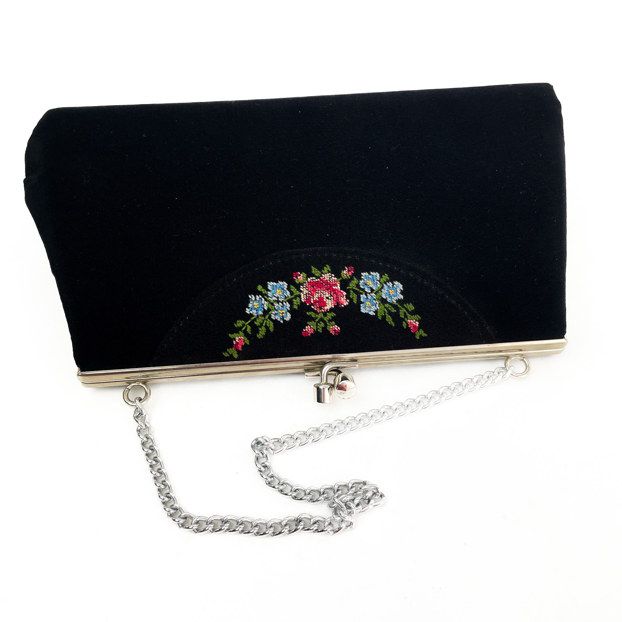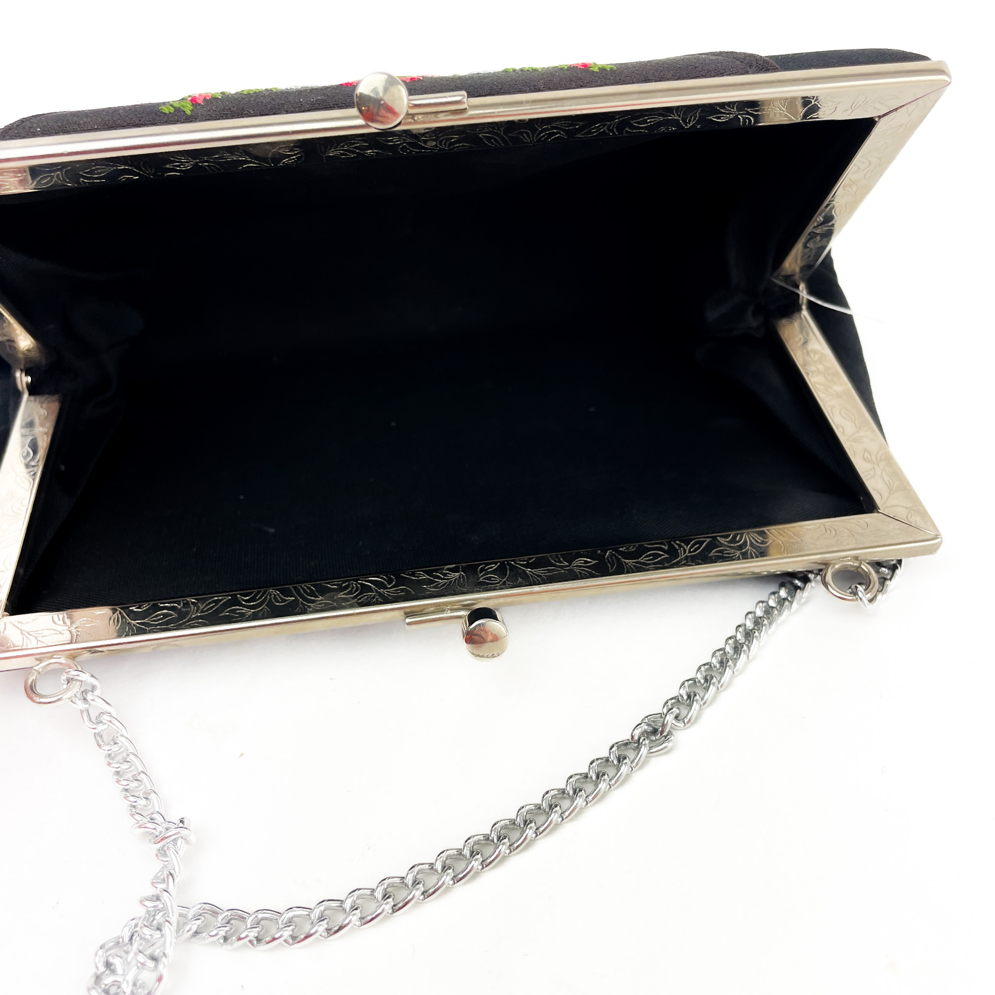 Smuk sort vintage selskabstaske med dekorativt blomstermotiv på fronten.