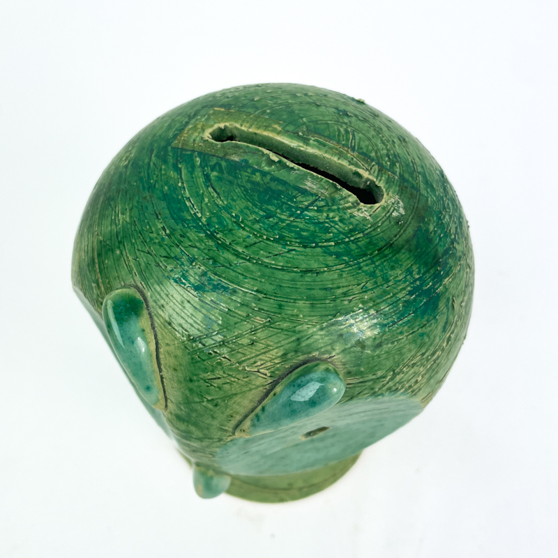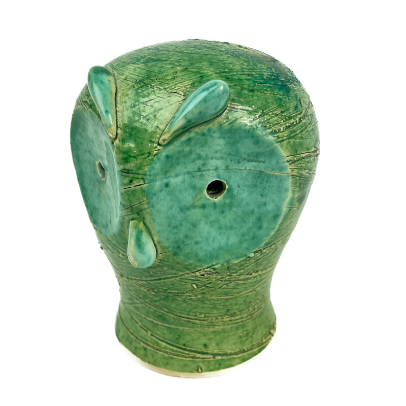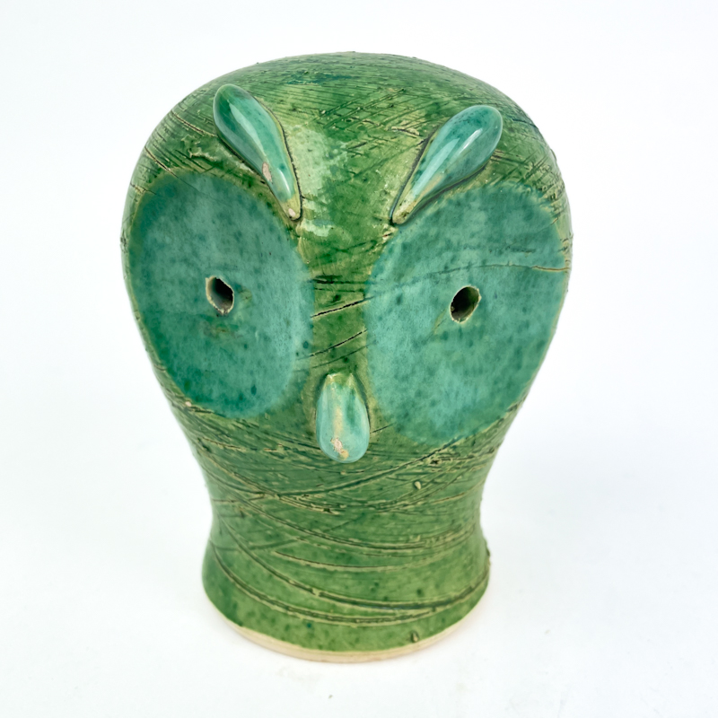 Karakterfuld retro spareugle i grønt glaseret stentøj med tydeligt modellerede øjne, næb og fine indridninger i overfladen.