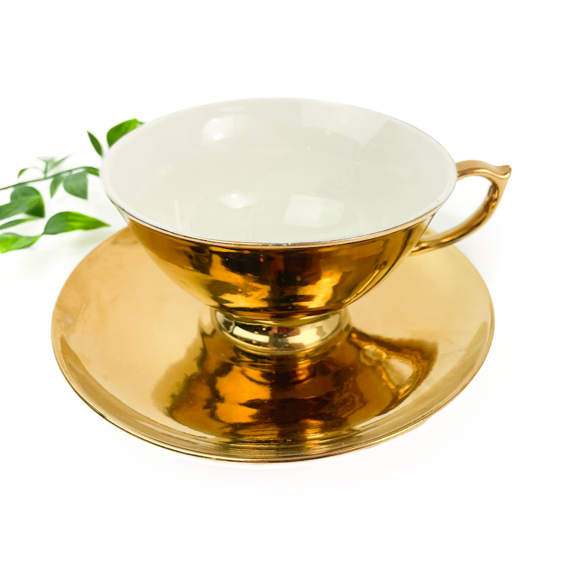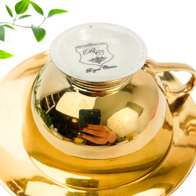 Smuk gylden vintage tekop med tilhørende underkop fra Royal Classic med blank yderside og hvid glaseret inderside.
