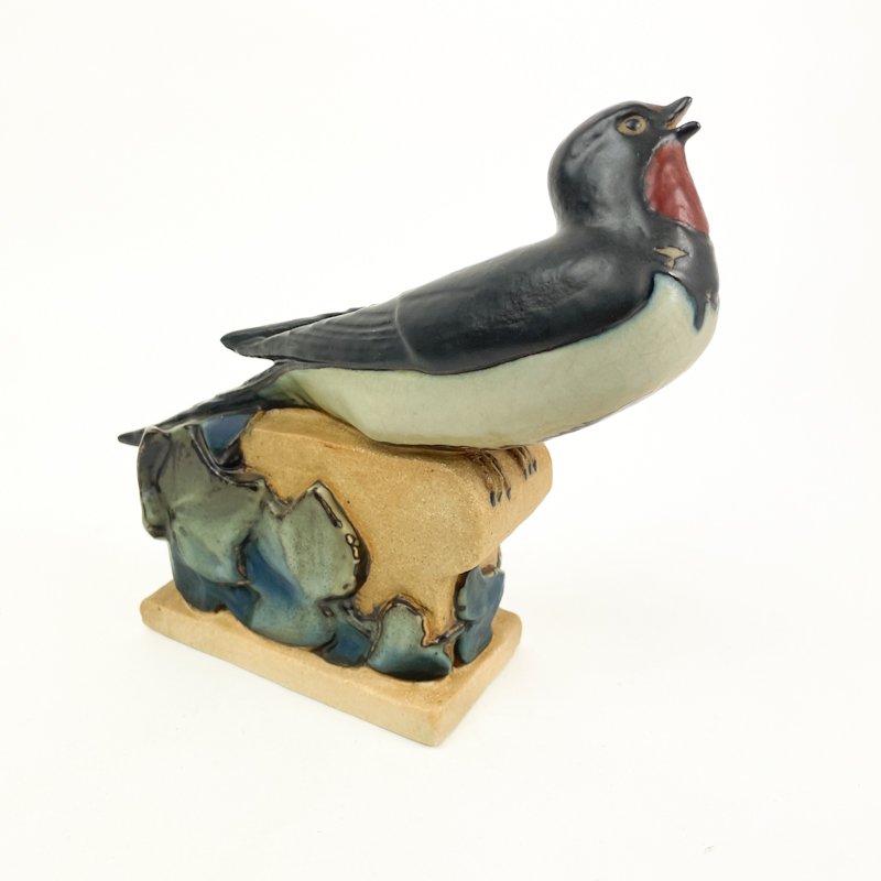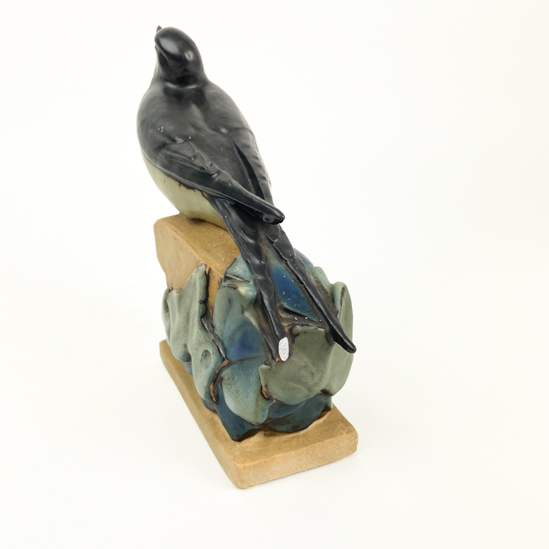Figuren forestiller en siddende fugl placeret på en stiliseret sokkel med relief og levende glasurforløb.