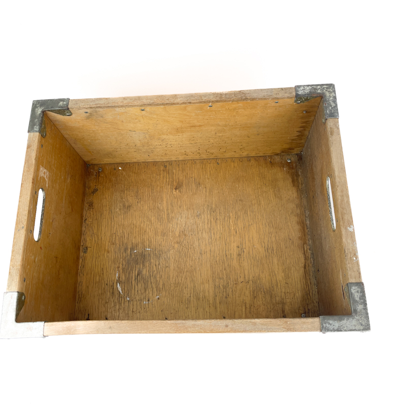 Original retro trækasse i massivt træ med metalbeslag og rødt påtryk Iversens Bakelit – Plastik.