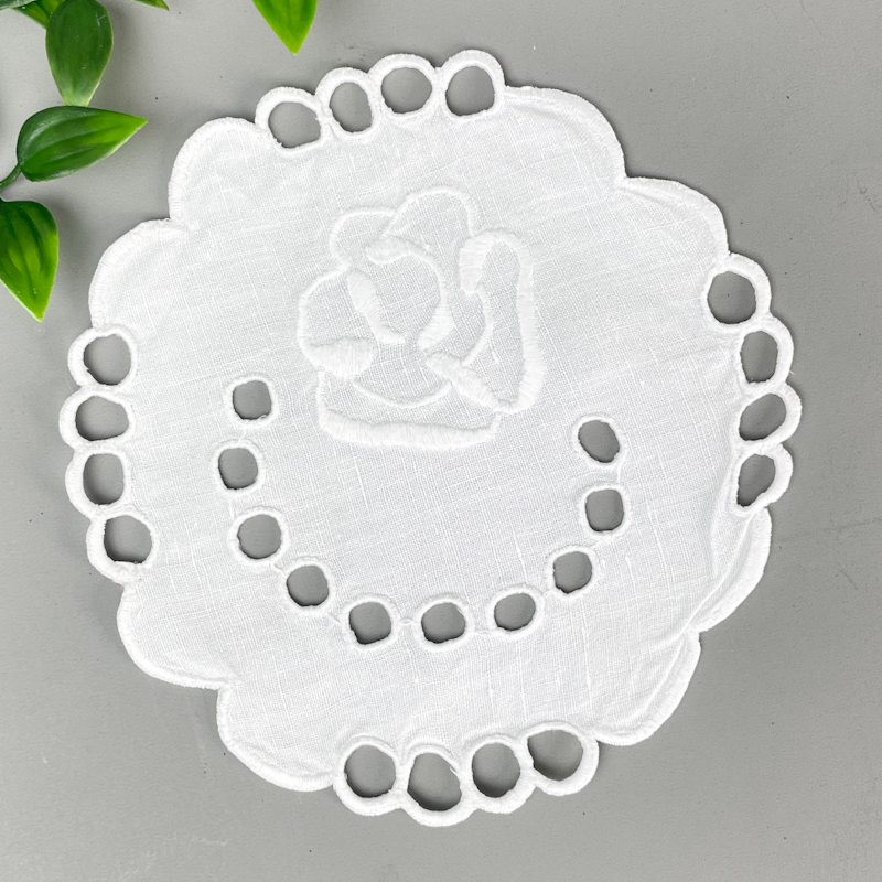 Fin lille vintage flakon i hvidt tekstil med smukt gammelt håndarbejde i form af broderet motiv og gennemskåret mønster.