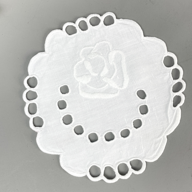 Fremstillet i hør med let og naturlig struktur, typisk for ældre håndarbejde til små flasker og pynt.
