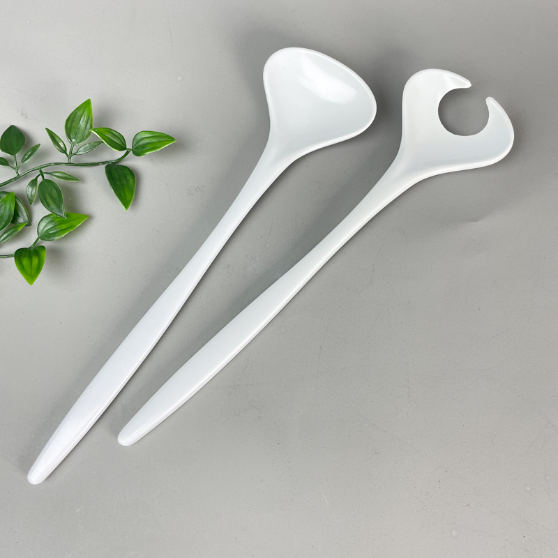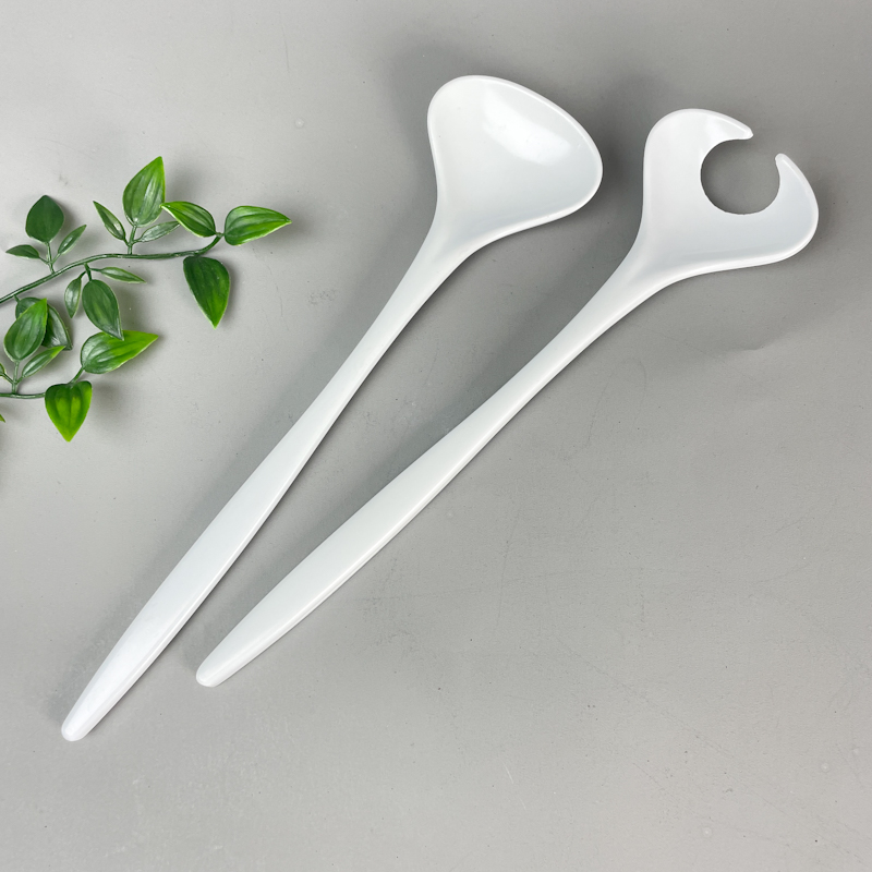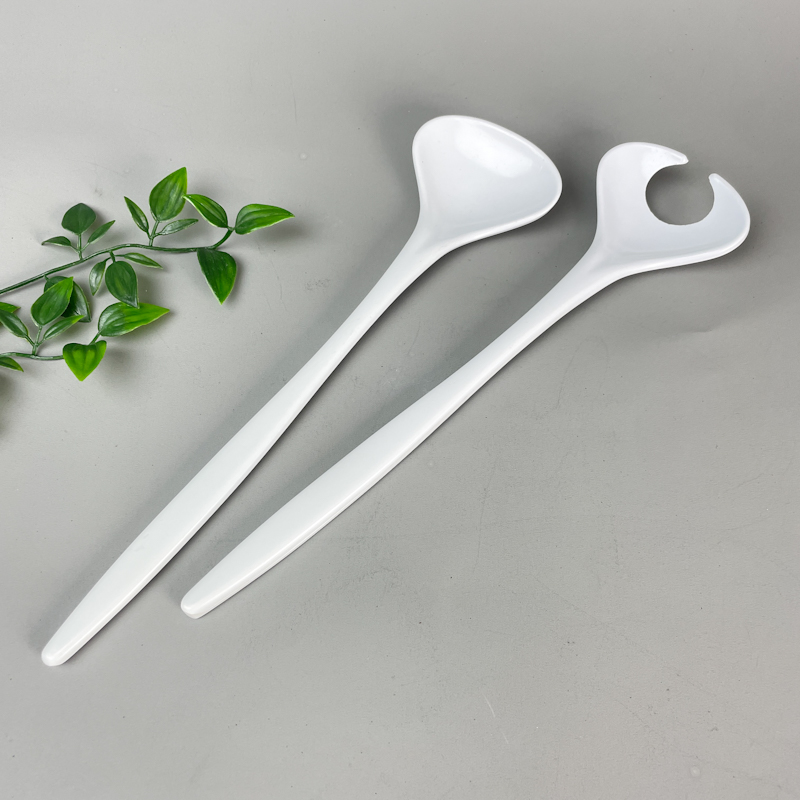 Retro salatbestik i hvid udførelse bestående af én salatske og én salatgaffel med karakteristisk åben form.