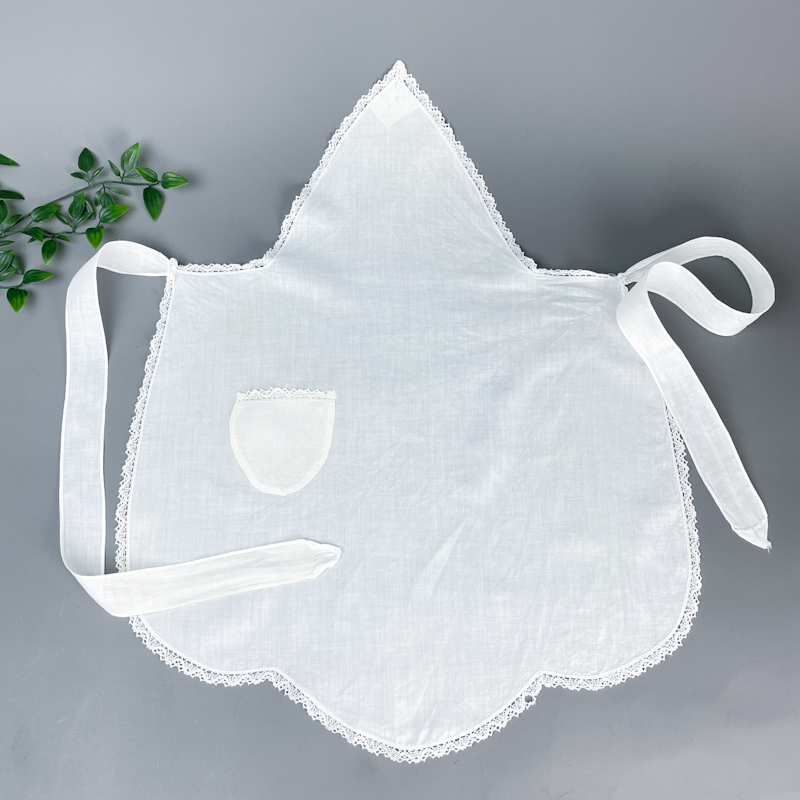 Let og fint vintage serveringsforklæde i hvid tekstil med smal blondekant langs hele kanten.