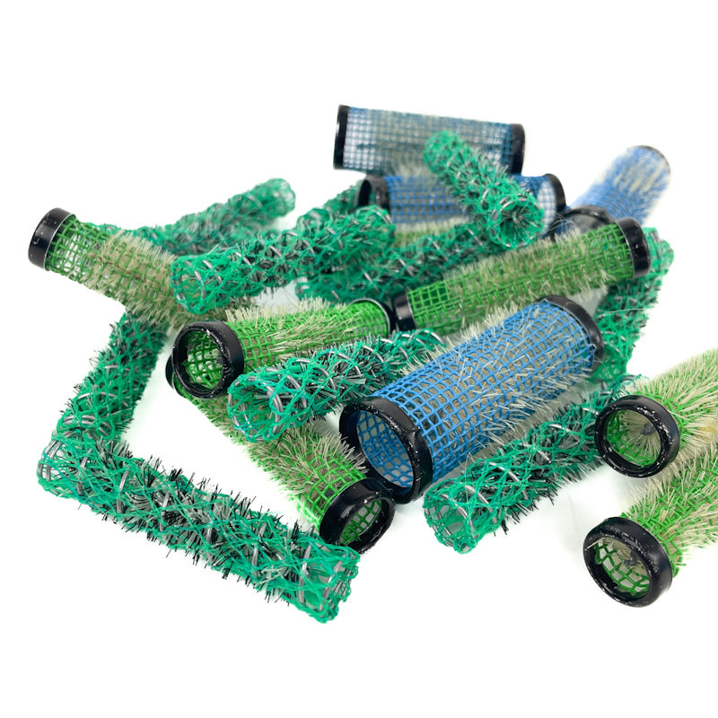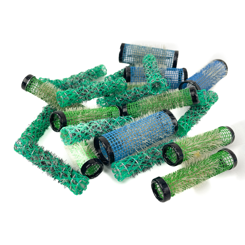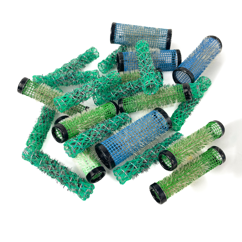 Samling af vintage hårruller i grønne og blå nuancer i forskellige størrelser.
