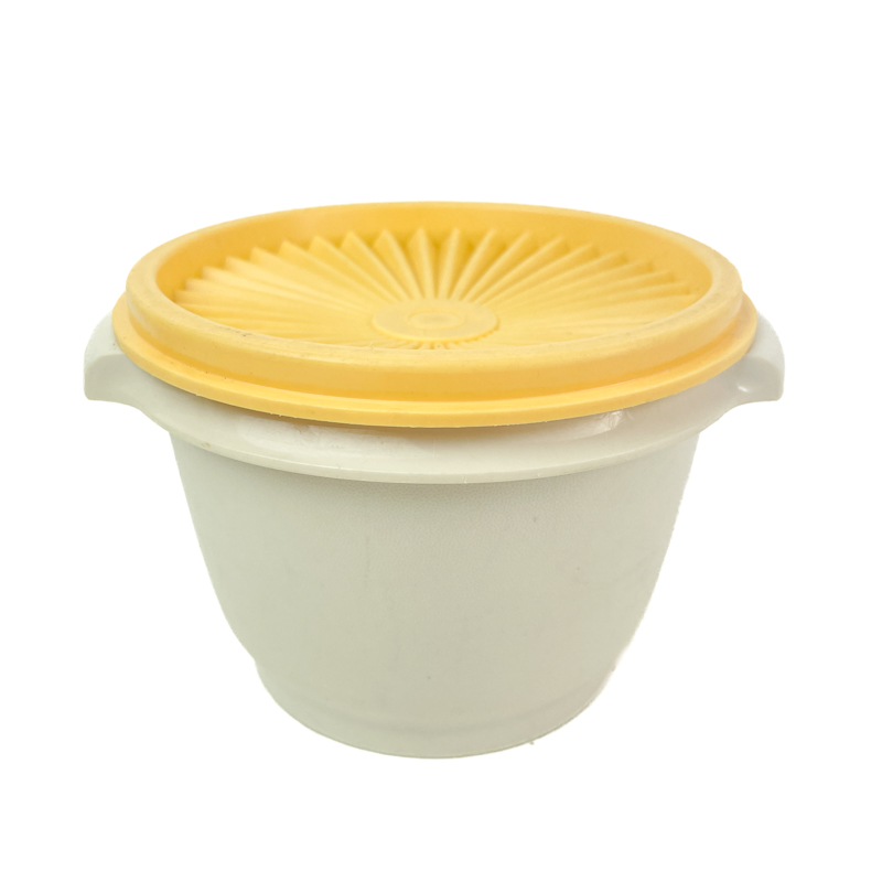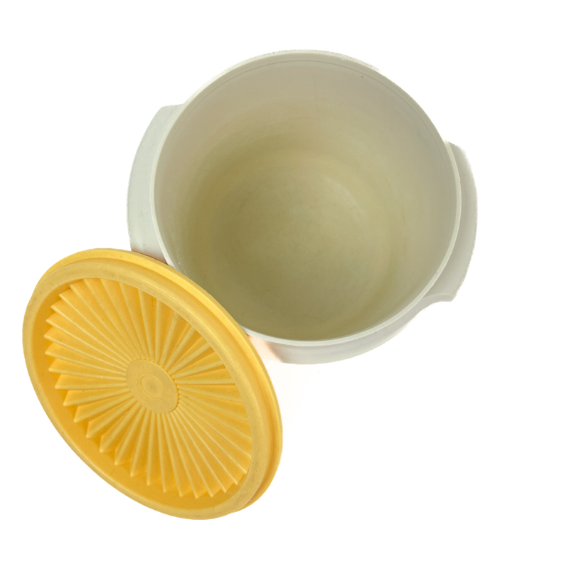 Vintage Tupperware plastbøtte i lys plast med originalt gult låg.