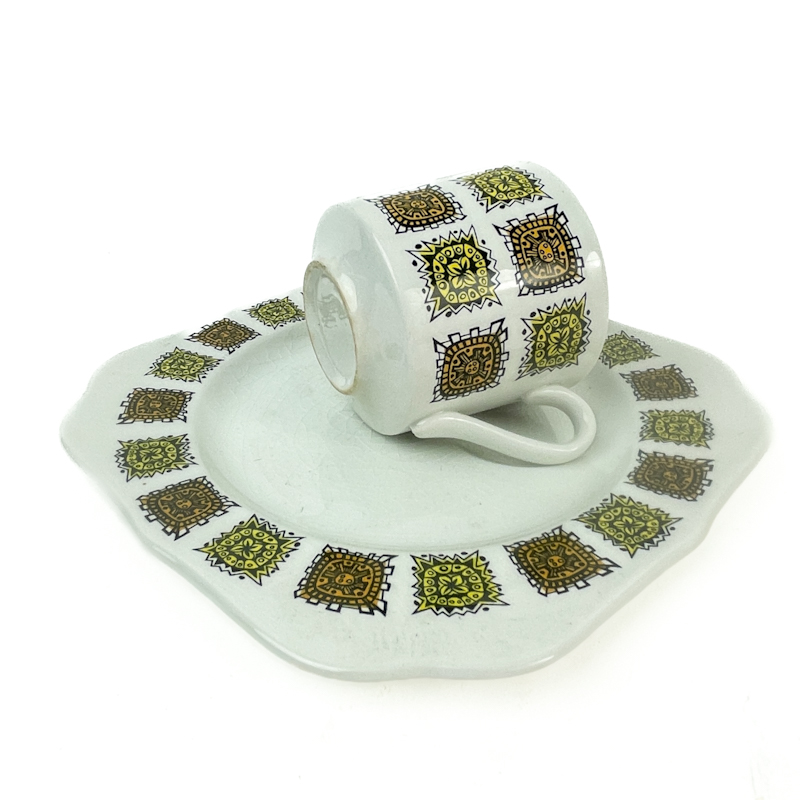 Smuk vintage morgenmadstallerken med matchende kop i hvidt ironstone, dekoreret med grafisk mønster i grønne og gyldne nuancer.