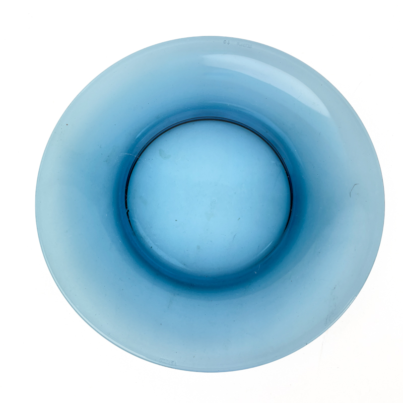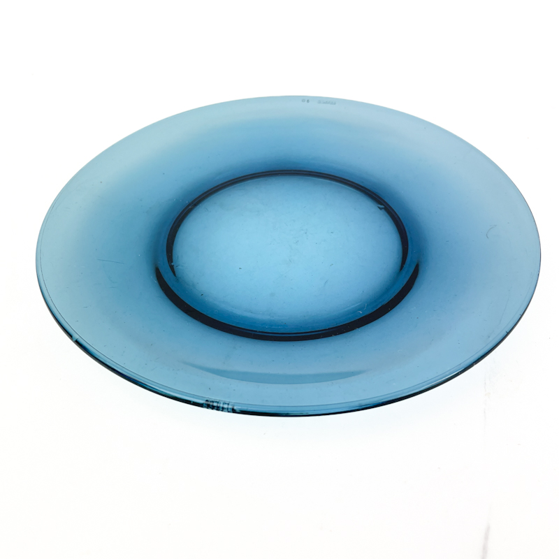 Enkel retro desserttallerken i transparent blåt glas med blød, rund form.