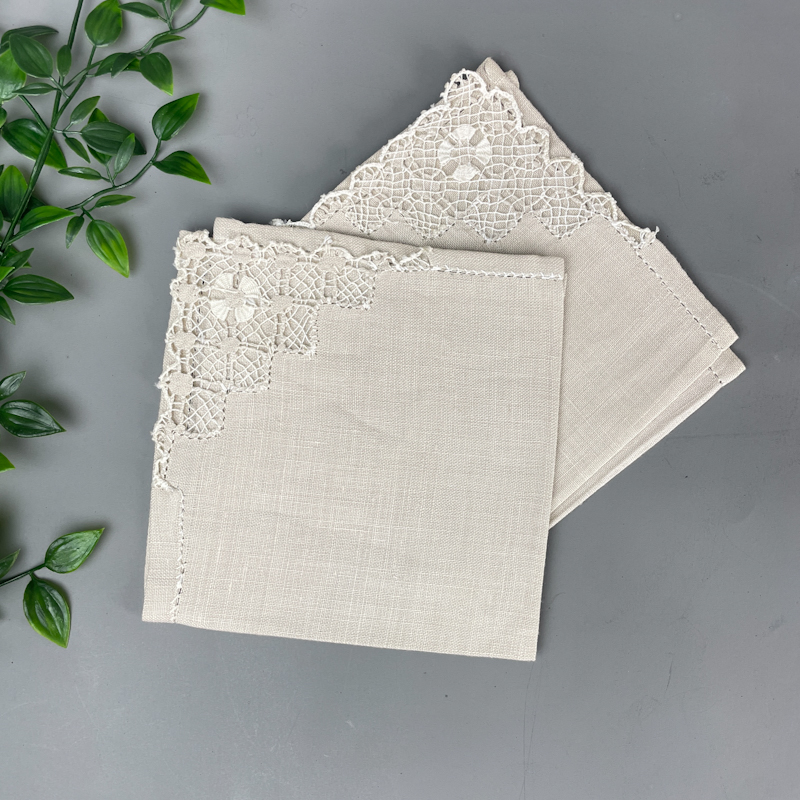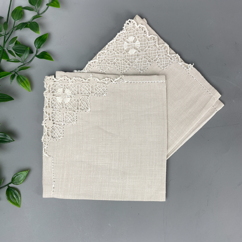 To fine vintage mundservietter i lyst linned med smukt gammelt håndarbejde i form af kniplet blondehjørne.