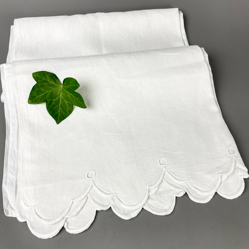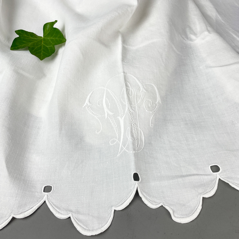 Hvidt vintage pyntelagen i ren bomuld med smukt gammelt håndarbejde i form af broderi, monogram og bølget afslutning i den ene ende.
