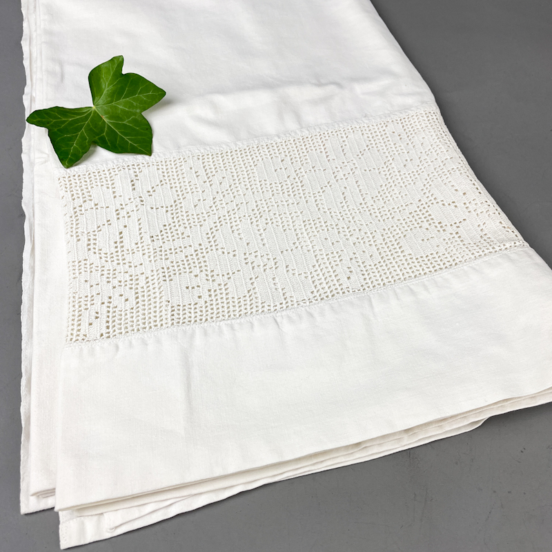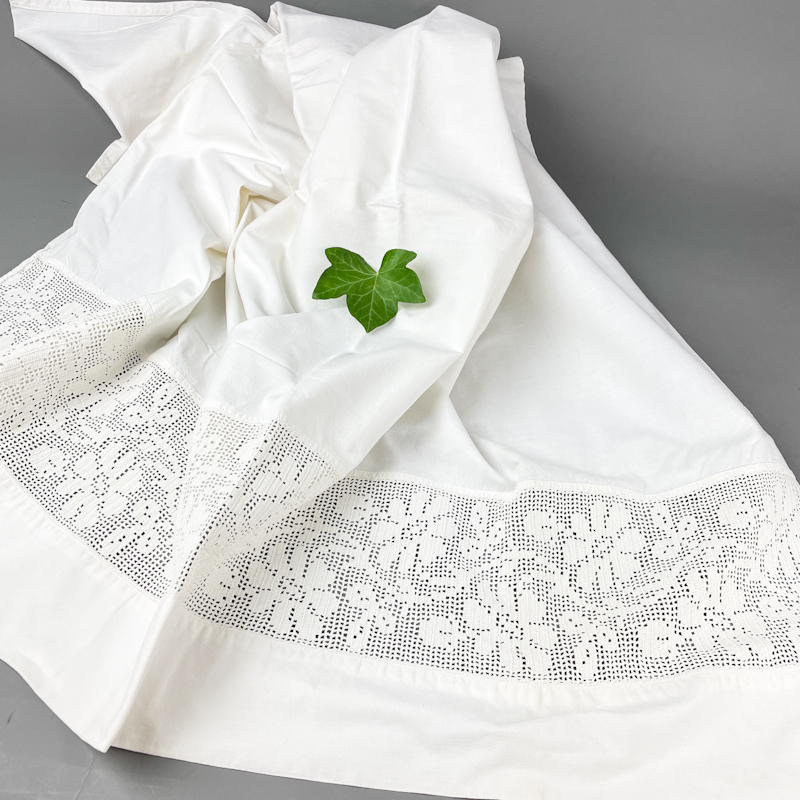 Hvidt vintage pyntelagen i ren bomuld med bredt mellemværk som et markant dekorativt felt i den ene ende.