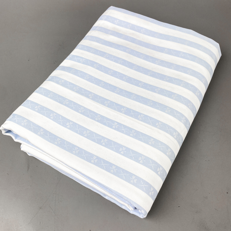 Et sæt klassisk vintage sengetøj i smuk, lyseblå damask med diskret stribet mønster.