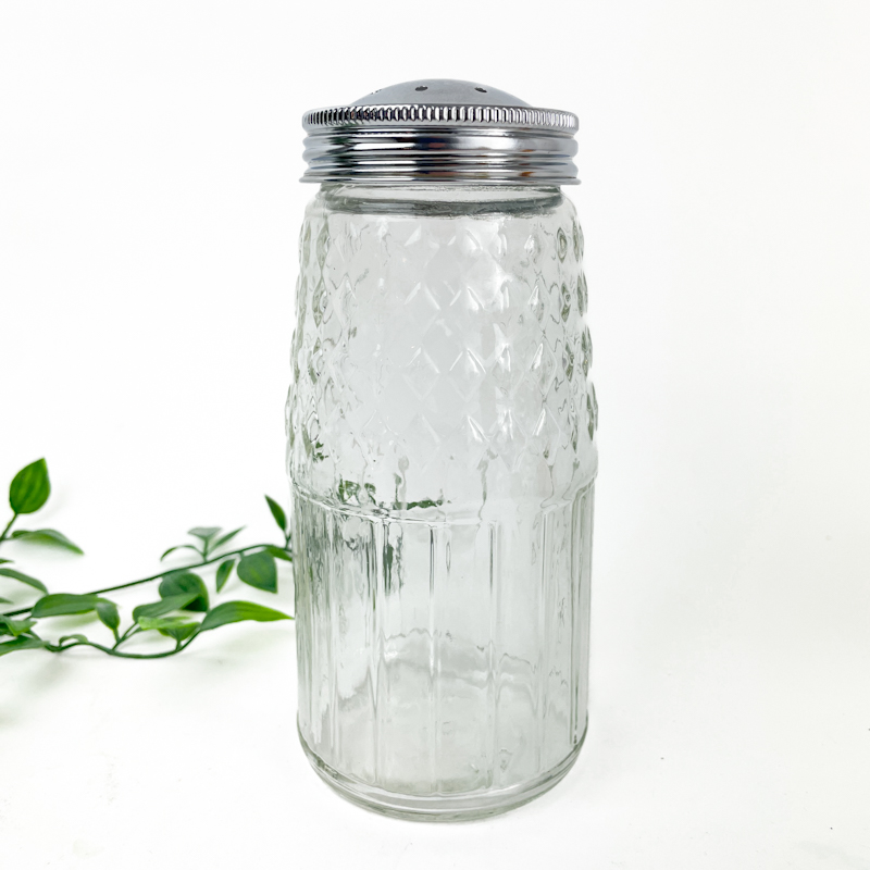 Stor sukkerstrøer i klart støbt glas med rillet og diamantformet mønster.