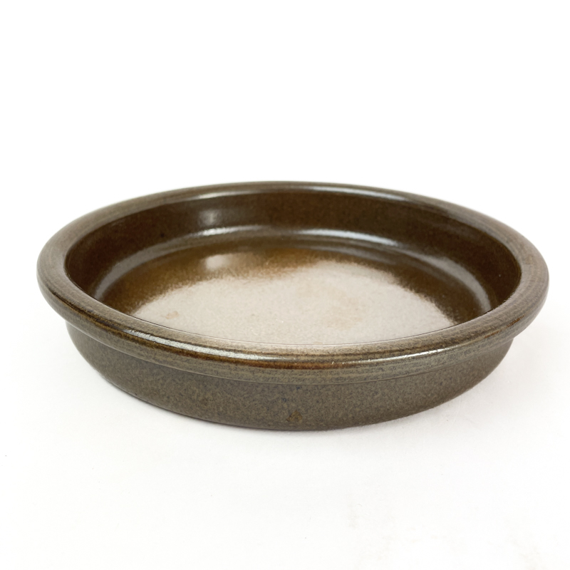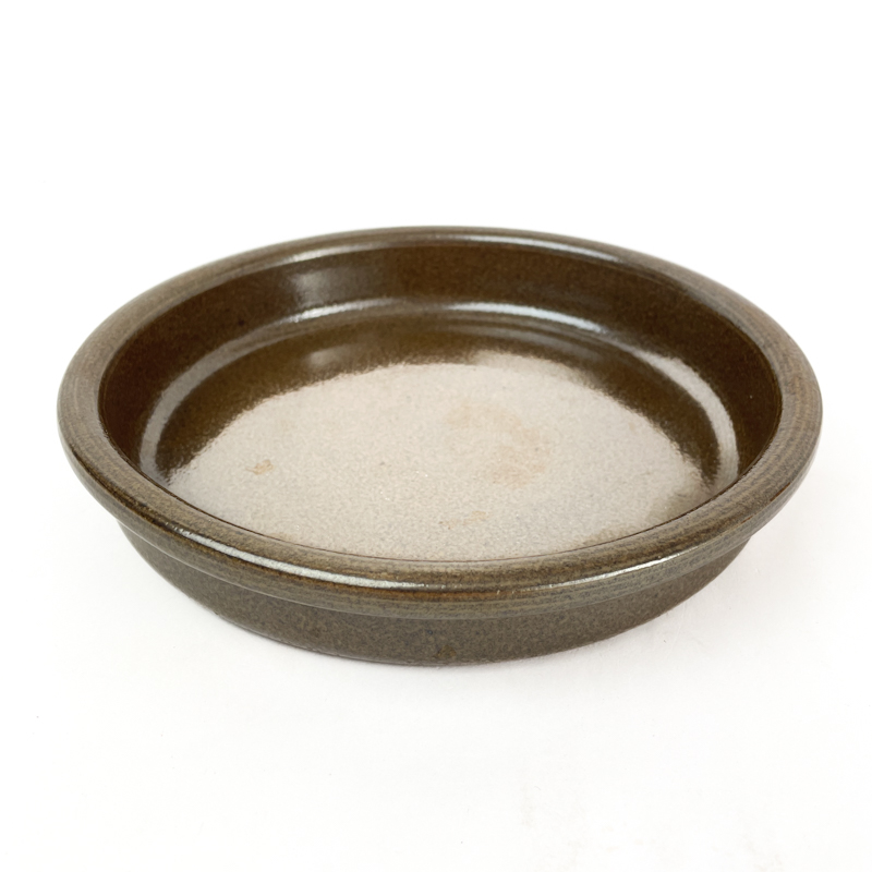 Rundt vintage fad i glaseret stentøj med dyb form og mørk glasur.