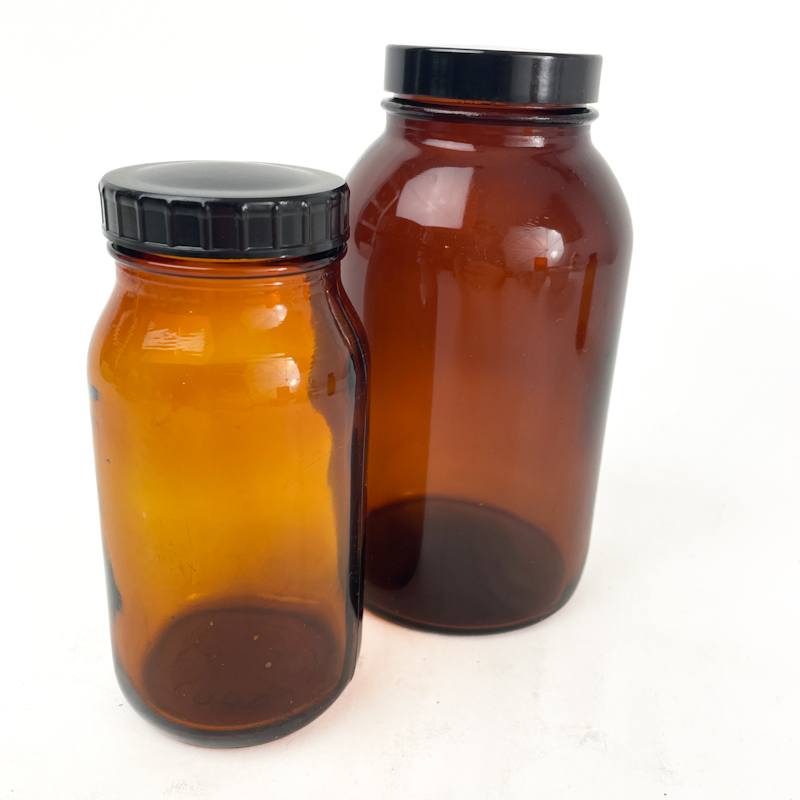 Sæt med to vintage opbevaringsglas i ravfarvet støbt glas med sort skruelukning.