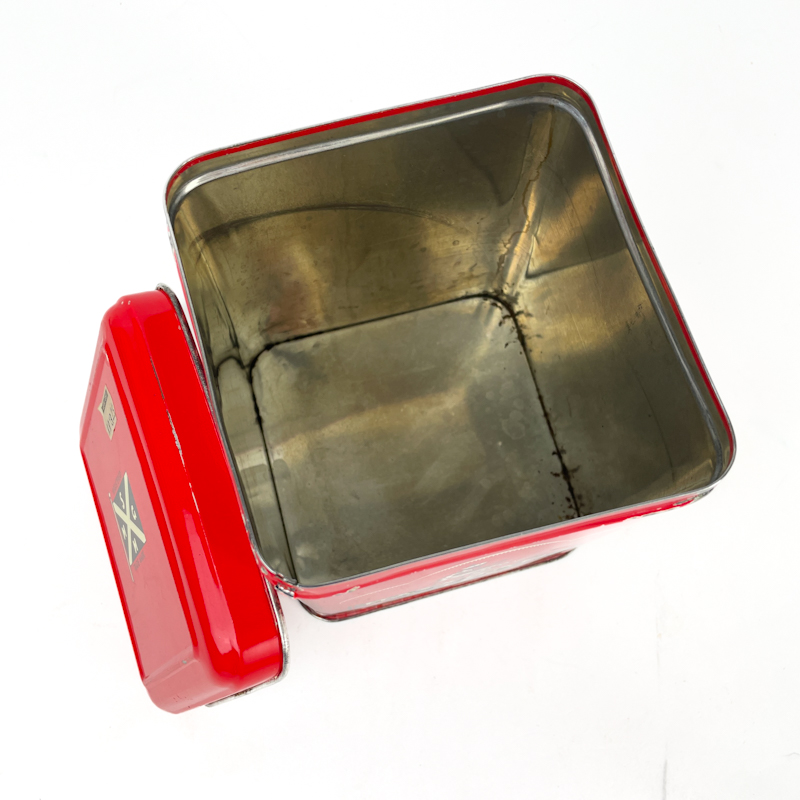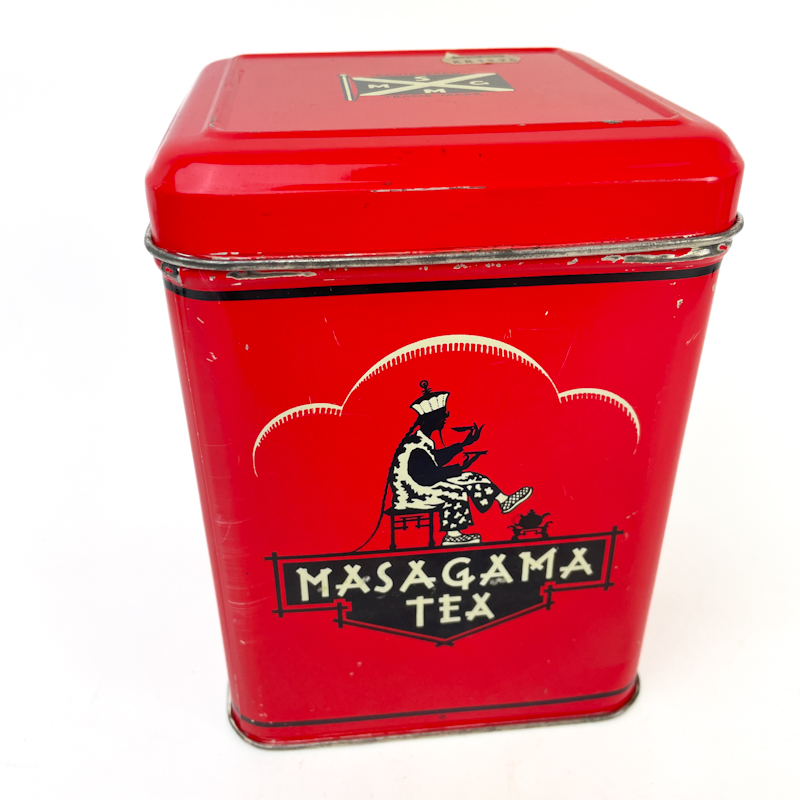 Klassisk vintage tedåse i metal med Masagama Tea-motiv i rød og sort.
