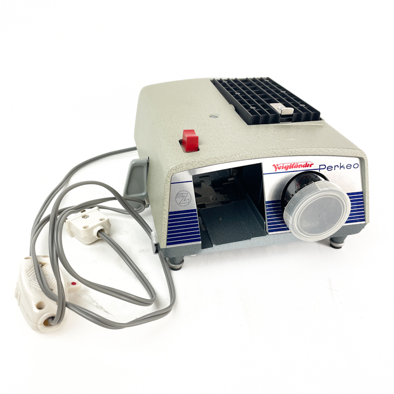 Klassisk Voigtländer Perkeo lysbilledapparat i grå metal med original front og betjeningsknapper.