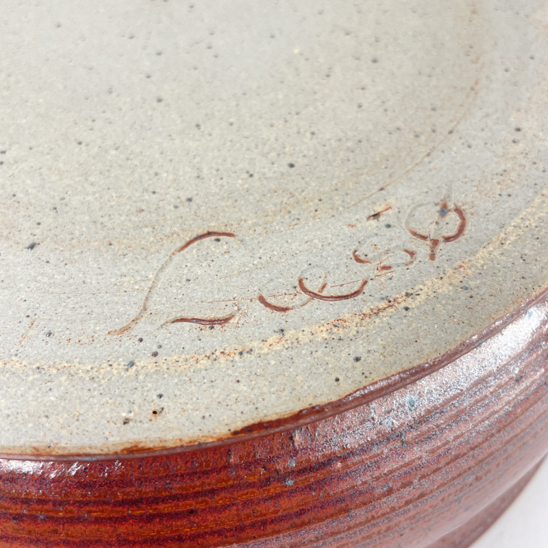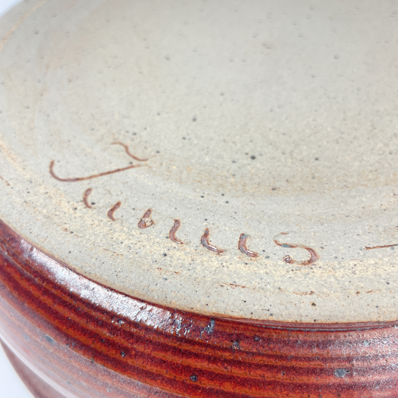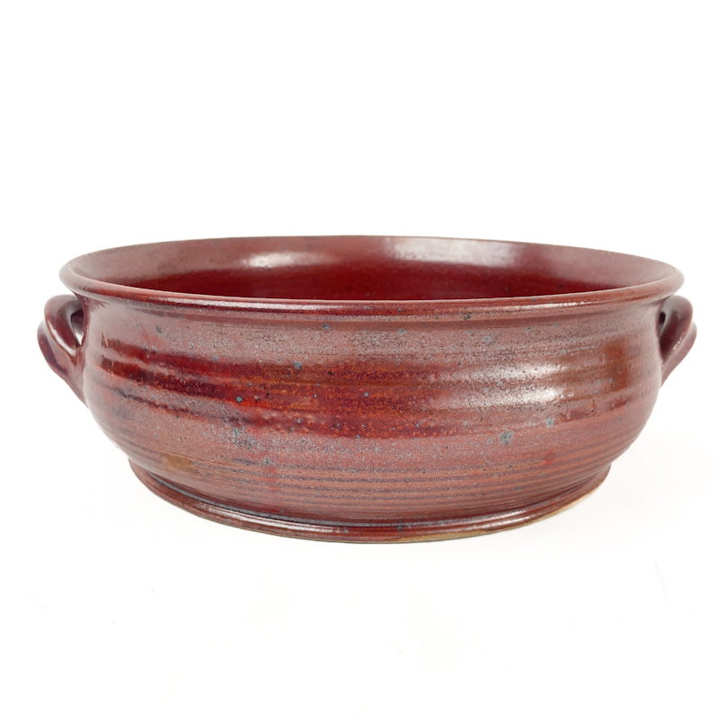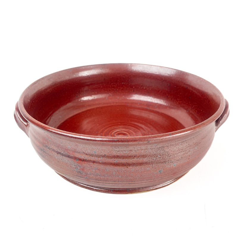 Stor vintage skål i rødbrunt stentøj fra Janus Keramik, Læsø, med to små sidehanke og drejet struktur.