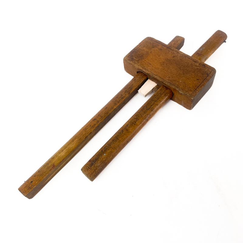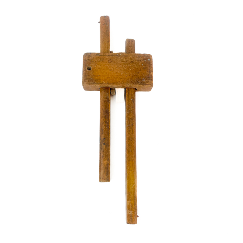Gammel vintage trætvinge udført helt i massivt træ med enkel, funktionel konstruktion.