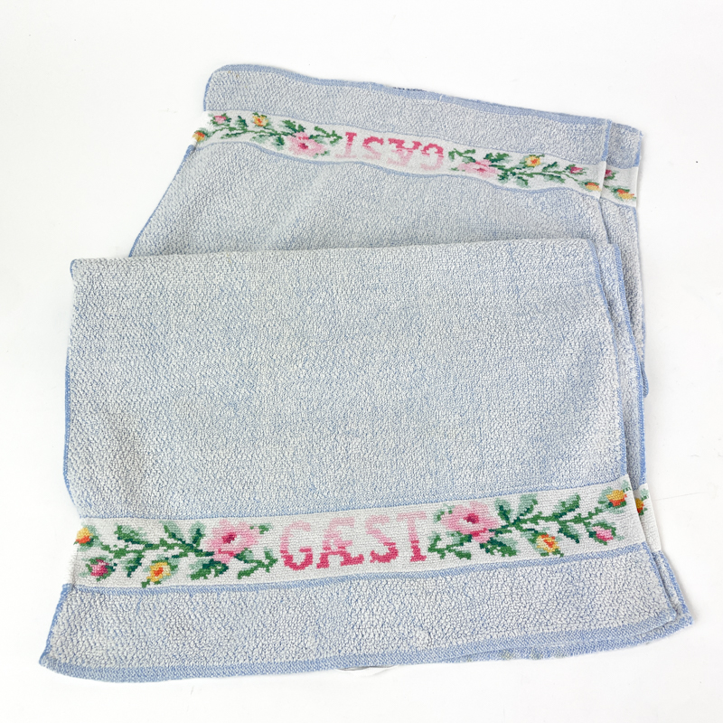 To lyseblå vintage gæstehåndklæder med vævet bort og blomster samt teksten Gæst.