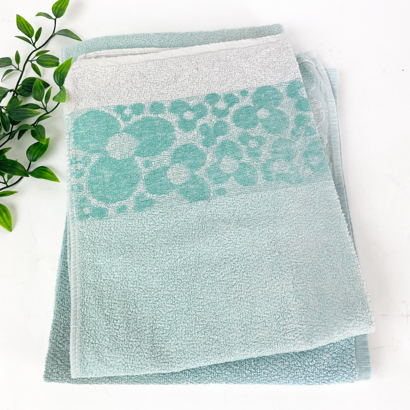 To ens mintgrønne retro håndklæder med vævet mønster og roligt, tidstypisk udtryk.