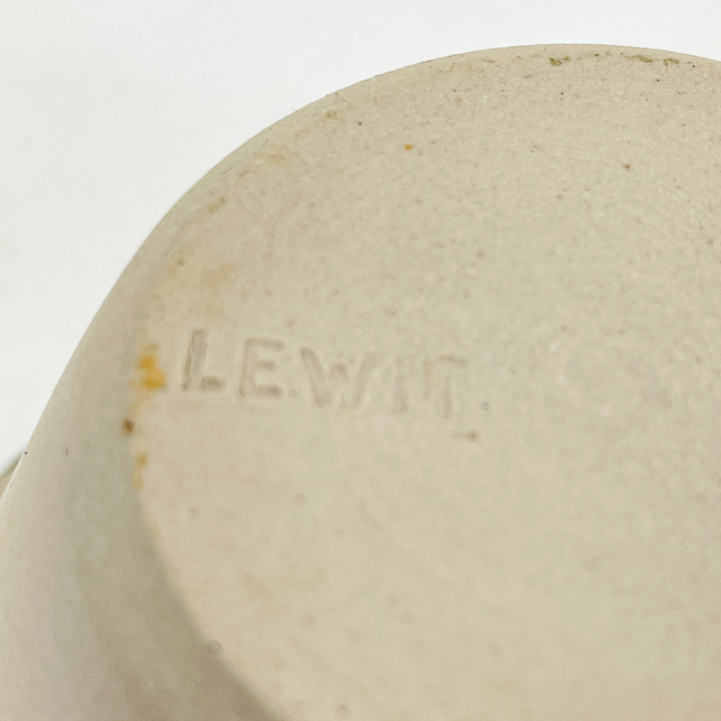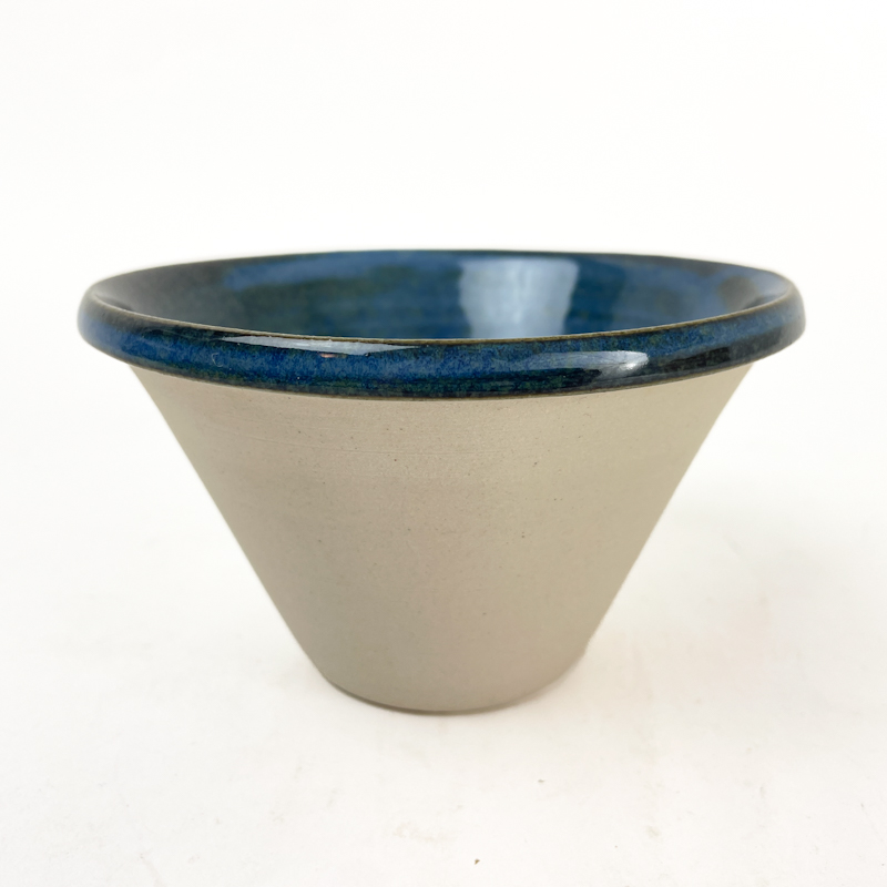 Vintage skål i stentøj med dyb blå glasur indvendigt og lys, naturfarvet yderside.