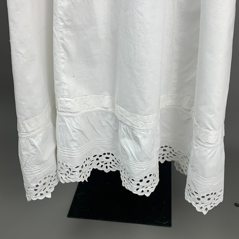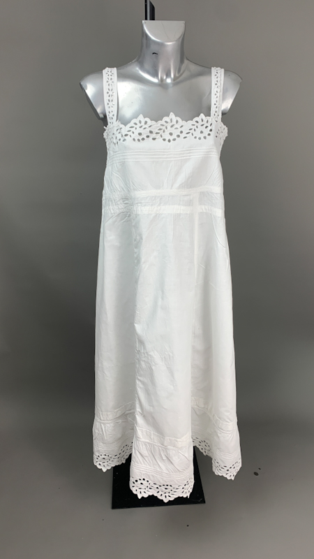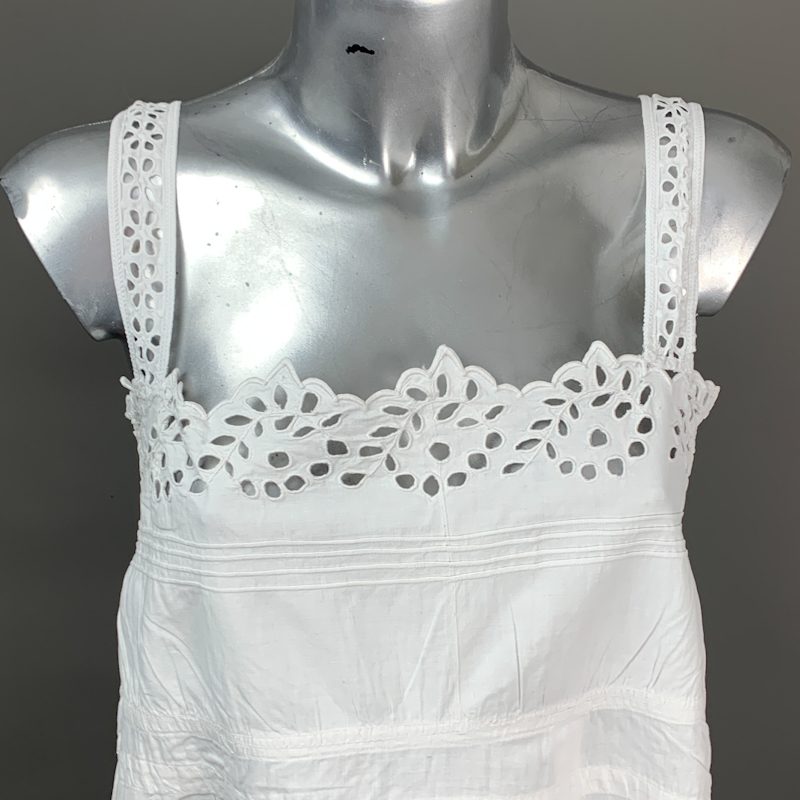 Hvid vintage natkjole med engelsk broderi ved bærestykke og nederste kant.