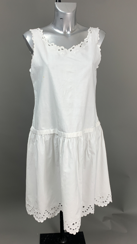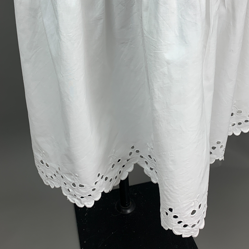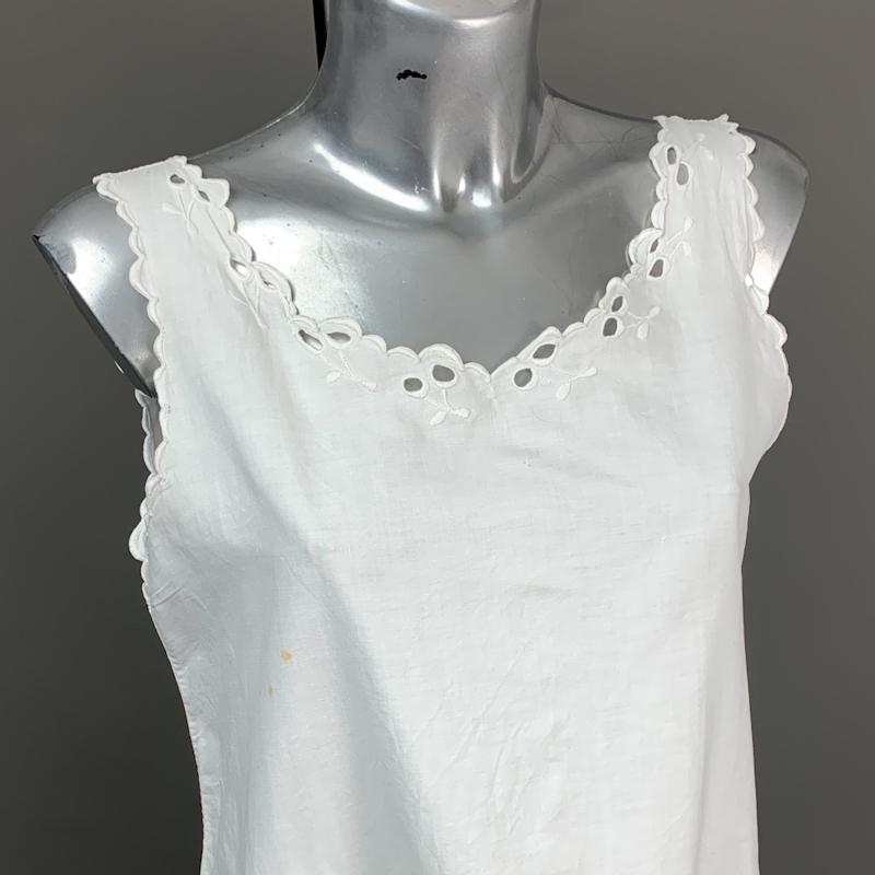 Vintage natkjole i hvid bomuld med enkel snit og dekorative hulbroderier langs udskæring og nederkant.