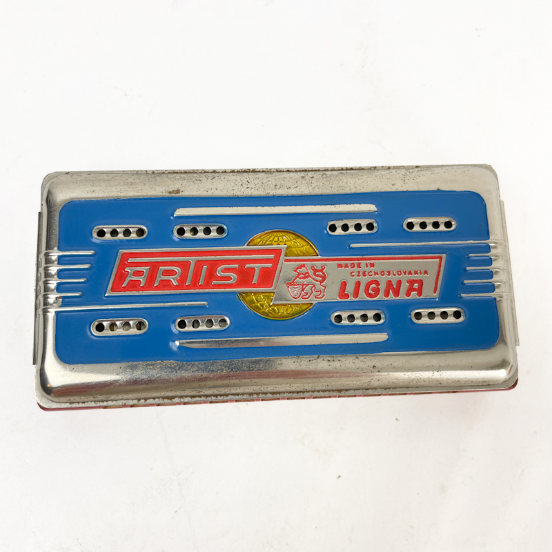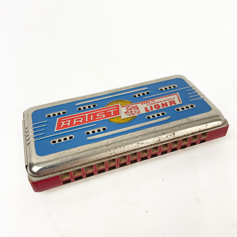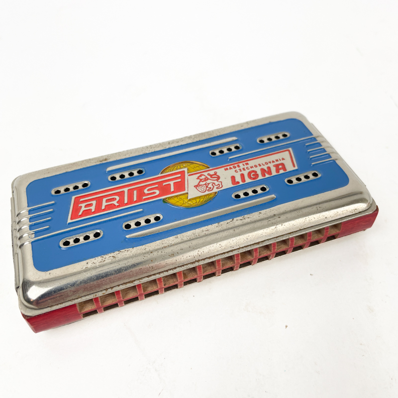 Vintage mundharmonika af mærket ARIST med metalhus og farvet frontplade.