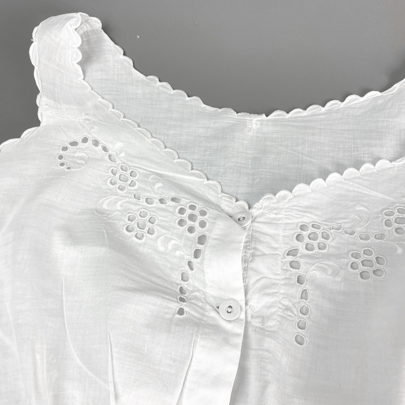 Broderet vintage top i bomuld med fine udskårne detaljer og bølget kant langs halsudskæringen.