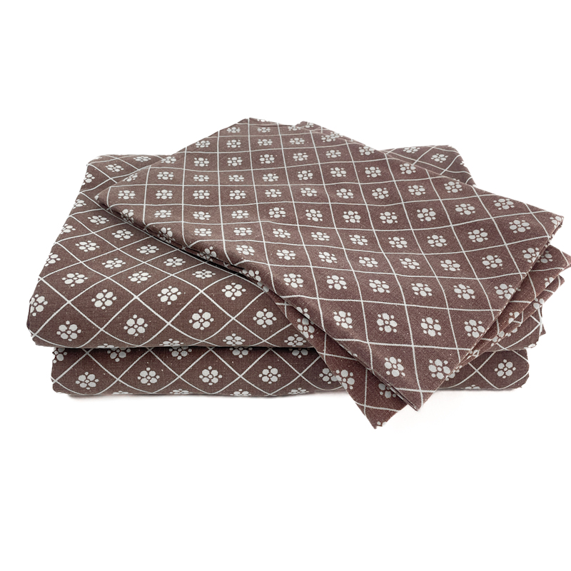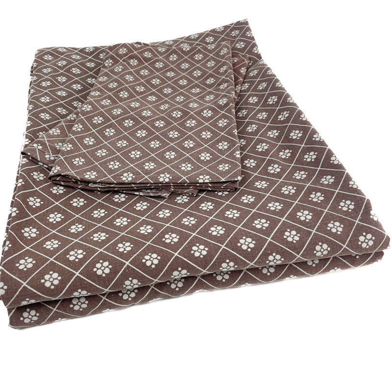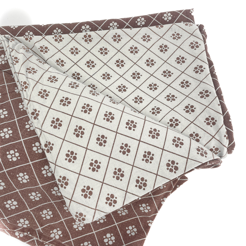Originalt retro sengetøj i brun og råhvid med klassisk grafisk mønster.