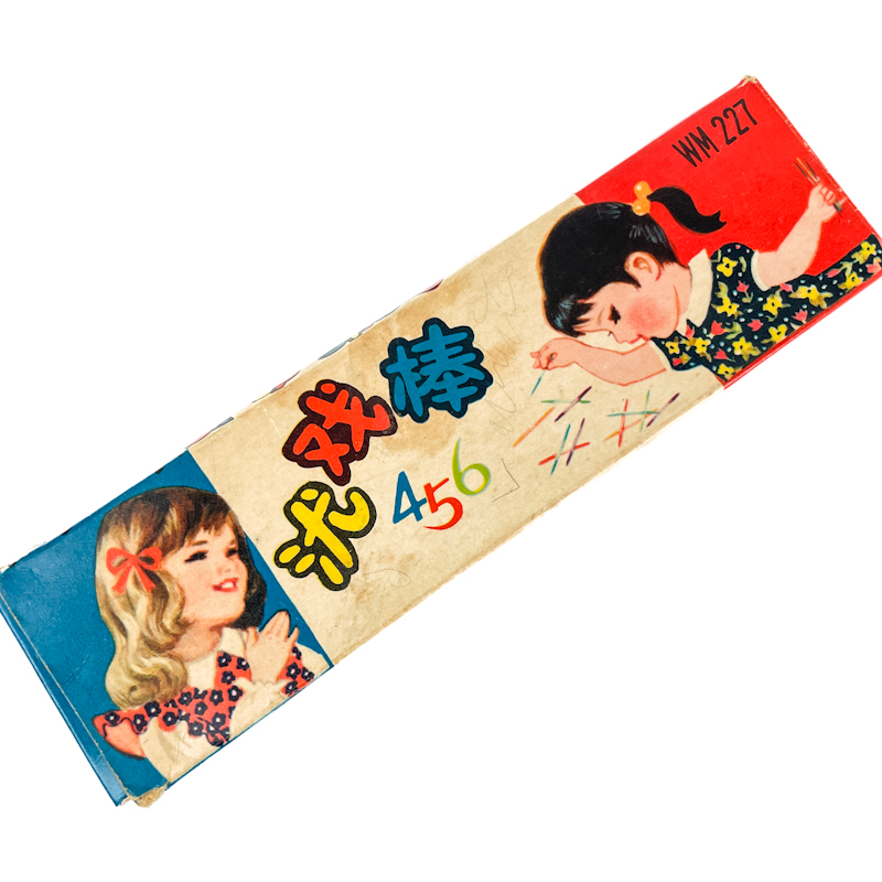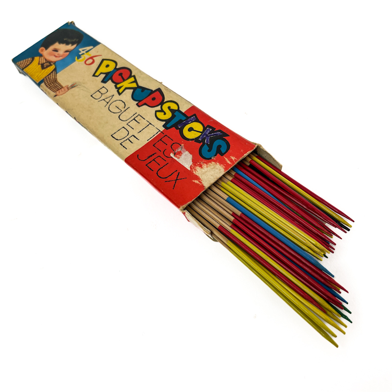 Originale retro mikadopinde i træ med farvede ender og illustreret papæske.