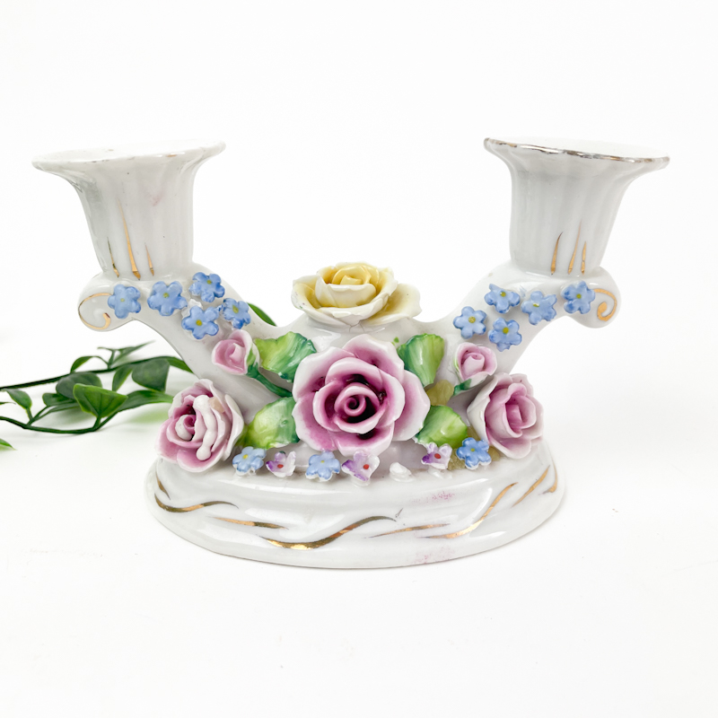 Smuk vintage porcelæns lysestage med to holdere og rigt dekorerede blomster i rosa, gul og blå nuancer.