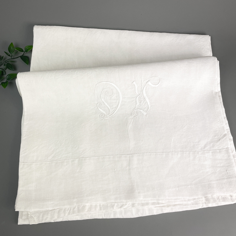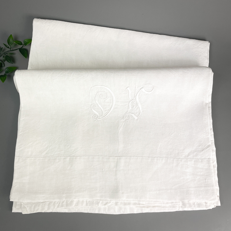 Lagnet har et diskret, elegant monogram broderet som smukt gammelt håndarbejde og et roligt, klassisk udtryk.