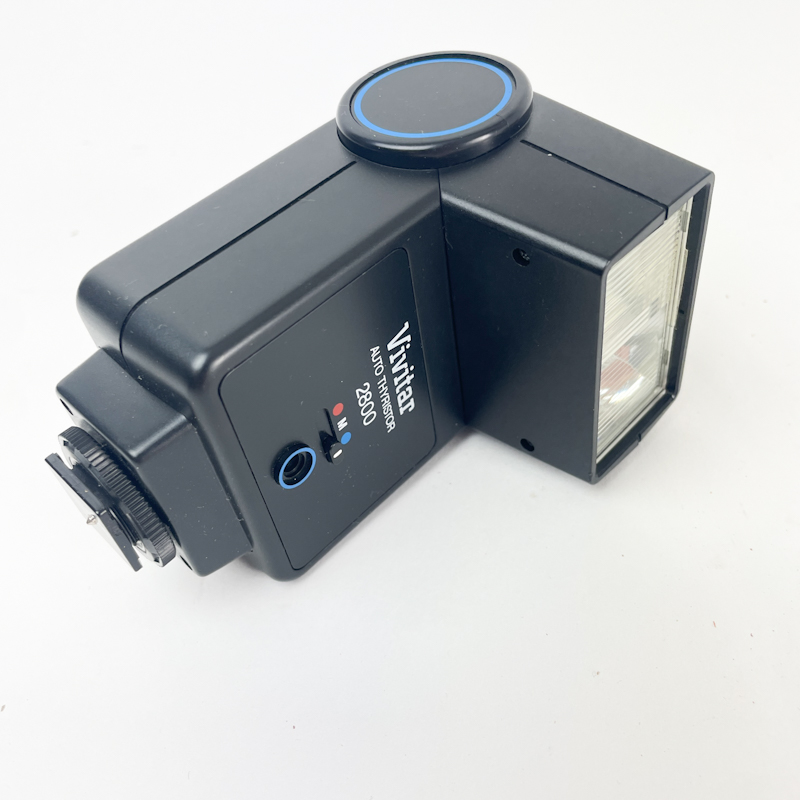 Vintage Vivitar 2800 kamerablitz i klassisk sort design.