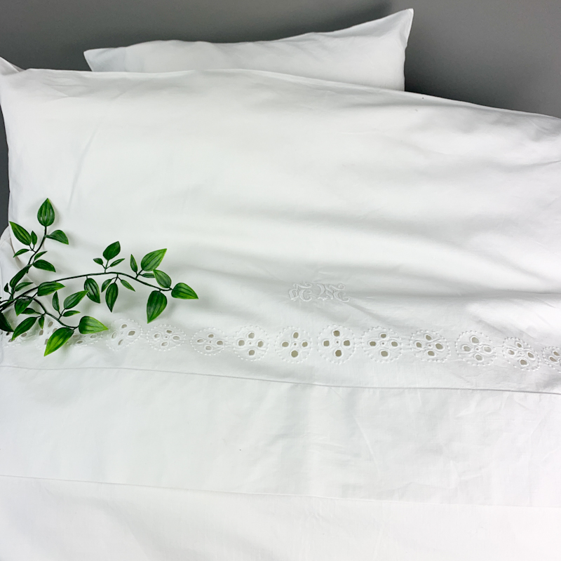 Sengetøjet består af dynebetræk og pudebetræk med fint gammelt håndarbejde i blonden og diskrete vævede striber i stoffet.