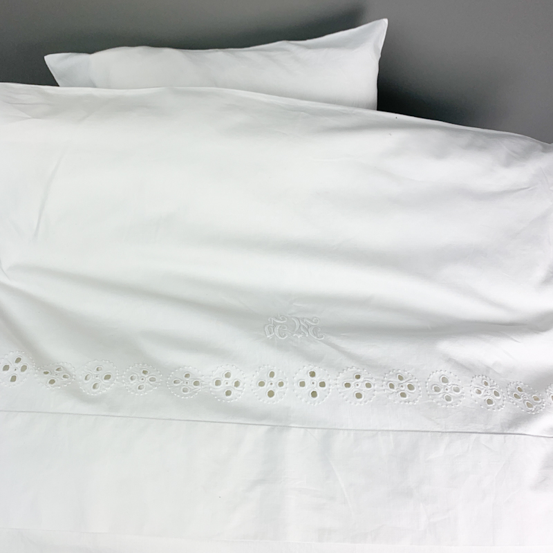 Smukt vintage babysengetøj i ren bomuld med klassisk hvidt udtryk og bred blondekant.