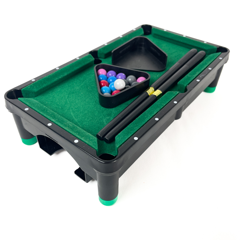 Retro mini poolbord i sort plast med grøn filt og kompakt, solid opbygning.