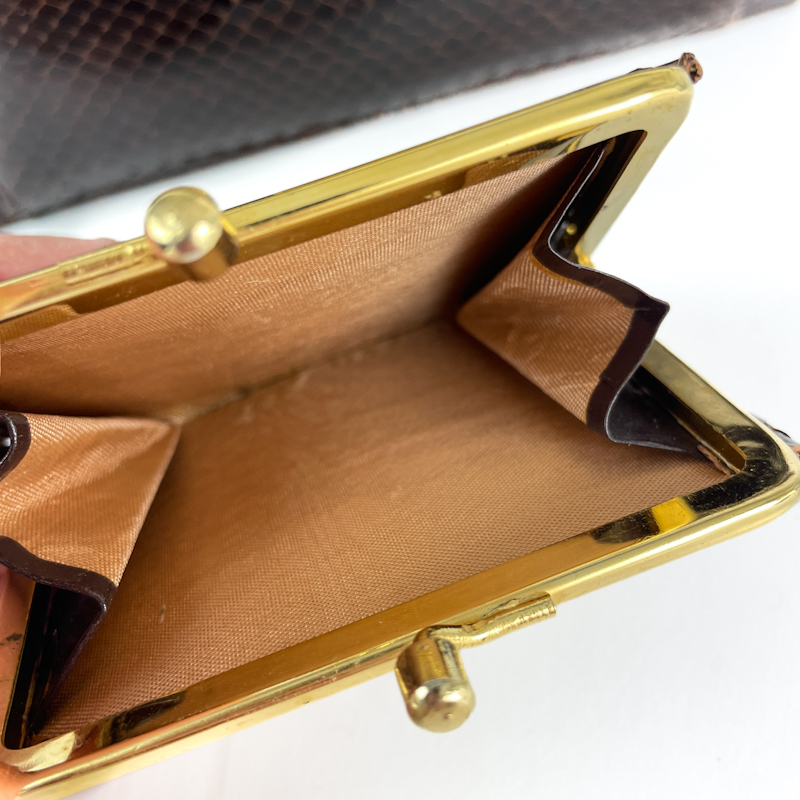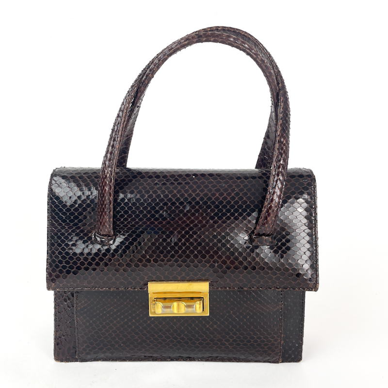 Vintage håndtaske i slangepræget skind med blank, mørkebrun overflade.